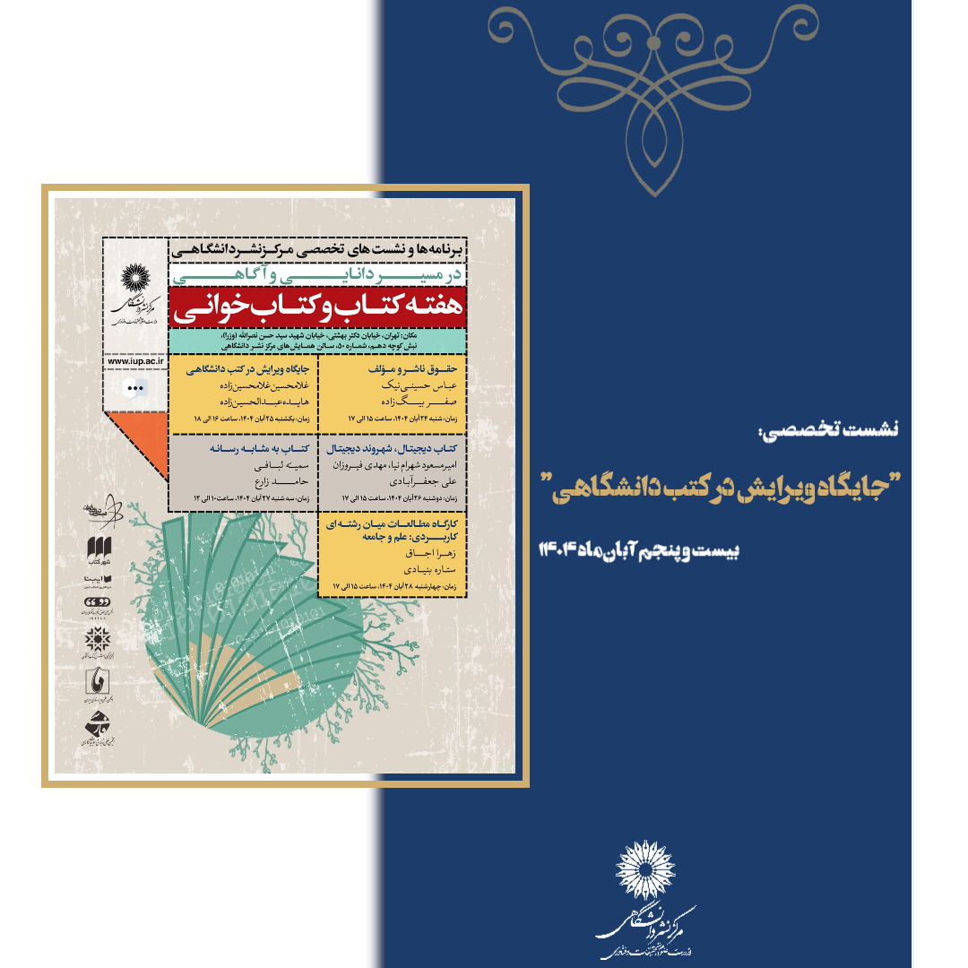 دومین نشست از سلسله نشستهای تخصصی مرکز نشر دانشگاهی به مناسبت هفته کتاب و کتابخوانی، روز یکشنبه ۲۵ آبانماه بهصورت حضوری و برخط در محل مرکز نشر دانشگاهی برگزار شد.