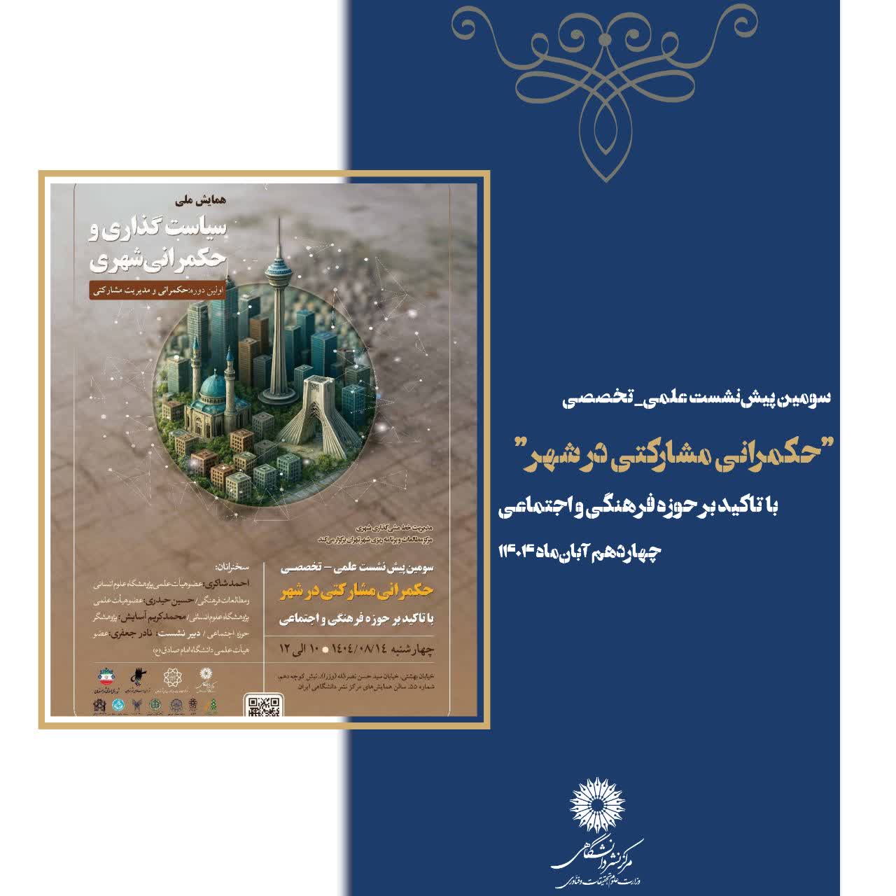روز چهارشنبه مورخ چهاردهم آبانماه۱۴۰۴، سومین پیشنشست علمی–تخصصی با موضوع «حکمرانی مشارکتی در شهر» در محل مرکز نشر دانشگاهی ایران برگزار شد.