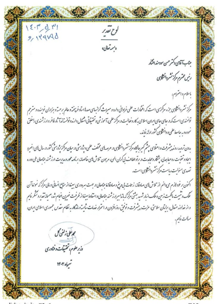 11 شهریور اخبار مرکز شرکت رئیس مرکز در مراسم تکریم و معارفه وزیر محترم علوم، تحقیقات و فناوری با حضور ریاست محترم جمهوری اسلامی ایران و به دعوت وزارت عتف 08/12/1403 توسط نشر دانشگاهی 0 دیدگاه به گزارش روابط عمومی مرکز نشر دانشگاهی، مراسم تکریم و معارفه وزیر علوم، تحقیقات و فناوری با حضور دکت... ادامه مطلب