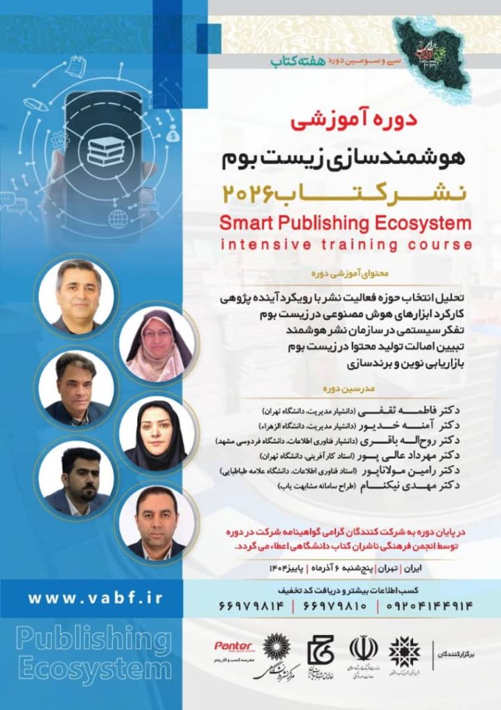 02 آذر اخبار مرکز دوره آموزشی «هوشمندسازی زیستبوم نشر کتاب 2026» 02/09/1404 توسط روابط عمومی 0 دیدگاه 📣 انجمن فرهنگی ناشران کتاب دانشگاهی و مرکز نشر دانشگاهی با همکاری نهادهای علمی برگزار میکنند :🔹... ادامه مطلب