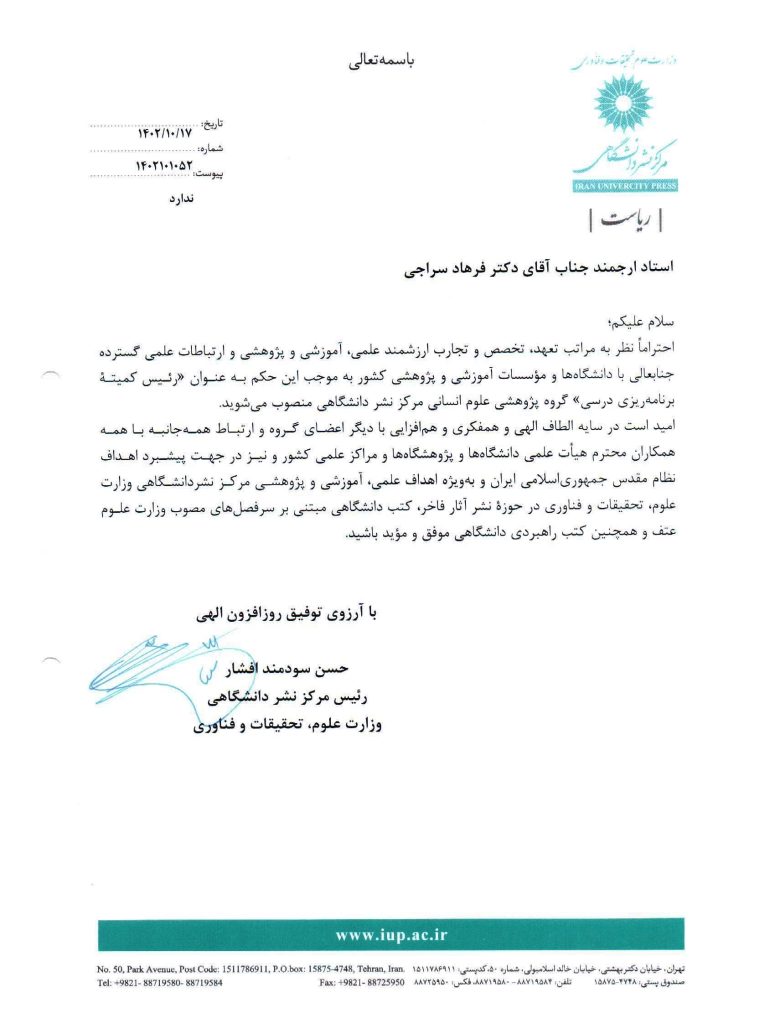 دکتر نژاد ابراهیمی، مدیرکل محترم دفتر سیاستگذاری و برنامهریزی امور پژوهشی وزارت عتف روز شنبه 6 اسفند 1401 به همراه آقای دکتر طاهری، عضو محترم کارگروه نمایه سازی نشریات در مرکز نشر دانشگاهی حضور یافت.